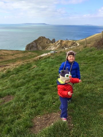 After venturing to get change for the car park there, we hiked on this little trail down to Durdle Door--this naturally formed eroded archway in the rocks. Durdle Door is also part of the Jurassic Coast (England's first World Heritage Site). Starting in Exmouth in East Devon and ending in Swanage in Dorset, it encompasses 185 million years of geological history in 95 miles. There is a trail that goes the whole way if you wish to hike/camp it. Rocks differ in color according to the time periods represented and you can dig for fossils! The beach is made up of little reddish brown polished pebbles and then slightly larger gray rocks closer to the water. It's beautiful! Hailey insisted on walking up the steps by herself.